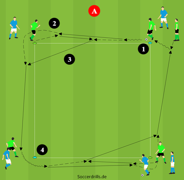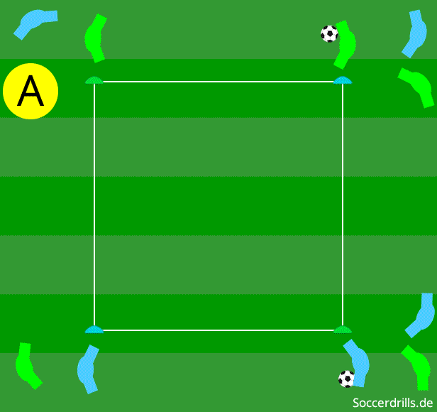 - Der Startspieler passt in den Lauf des Mitspielers, der an die nächste Ecke im Quadrat weiterleitet.