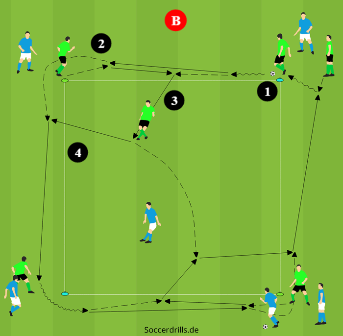 - Die Spieler folgen immer ihrem Pass zur nächsten Ecke und die Spieler im Zentrum werden nach einigen Durchgängen ausgetauscht.