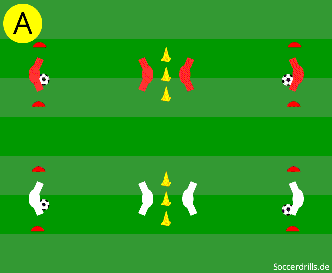 - Auf jeder Seite wird ein Spieler mit Ball postiert. Im Zentrum befindet sich jeweils ein Spieler rechts und links neben den Hütchen.