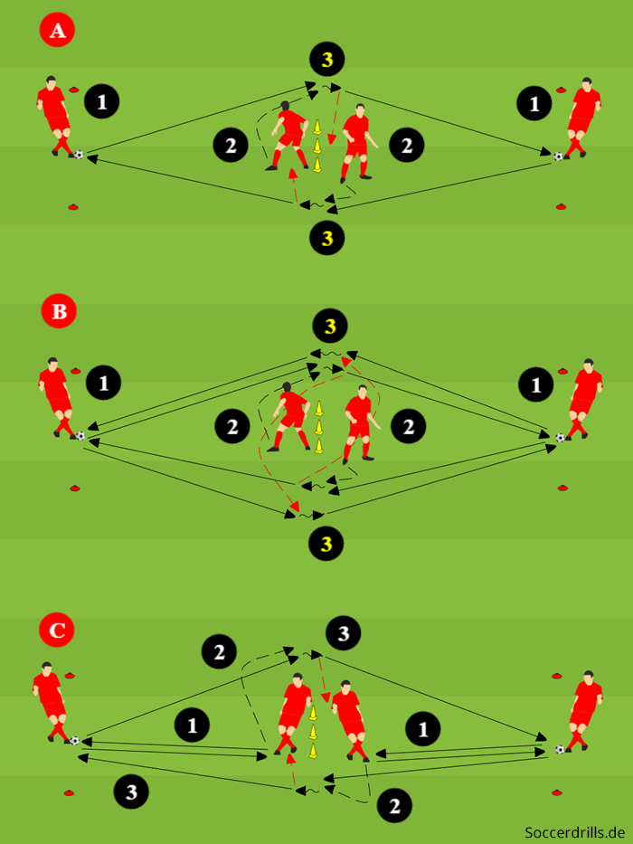 Die Abläufe müssen getimt werden und dazu sollten sich die Spieler gut orientieren und die Spielsituation richtig einschätzen. Mit einem Schulterblick können die Spieler im Zentrum beobachten, ob der Mitspieler auf der anderen Seite anspielbereit ist. Entsprechend wird der Pass druckvoll erfolgen oder etwas langsamer.