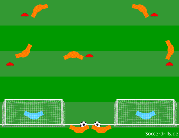 - Die beiden Tore stehen mit Abstand nebeneinander. In jedes Tor wird ein Torwart postiert.