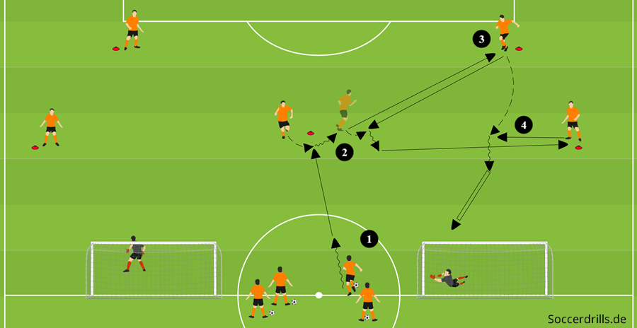 - Ablauf abwechselnd auf beiden Übungsseiten, später entscheiden die Spieler mit dem ersten Pass die Ablaufrichtung.