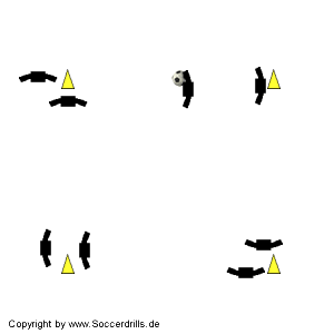 Der Spieler mit Ball passt - auf halber Strecke- zwischen den Hütchen direkt in den Lauf des nächsten Spielers. Bewegung gegen den Uhrzeigersinn. Anschließend folgt er seinem Pass in die nächste Gruppe. Die Intensität der Übung langsam erhöhen.