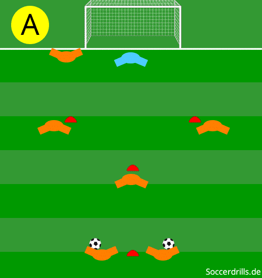 - Nach dem Pass vom Startspieler auf die tornahe Position, umläuft er den zentralen Spieler auf der anderen Seite. Der Passempfänger muss dann den Ball kontrollieren, sein Passweg wird länger und der Pass muss genau getimt werden.
