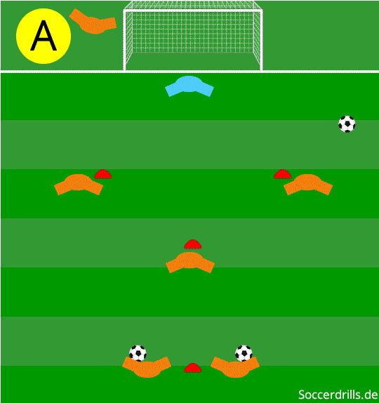 - Der Passempfänger klatscht den Ball seitlich zum Startspieler. Weiter geht es mit einem Direktpass auf die rechte Seite, zum Spieler an der tornahen Markierung.