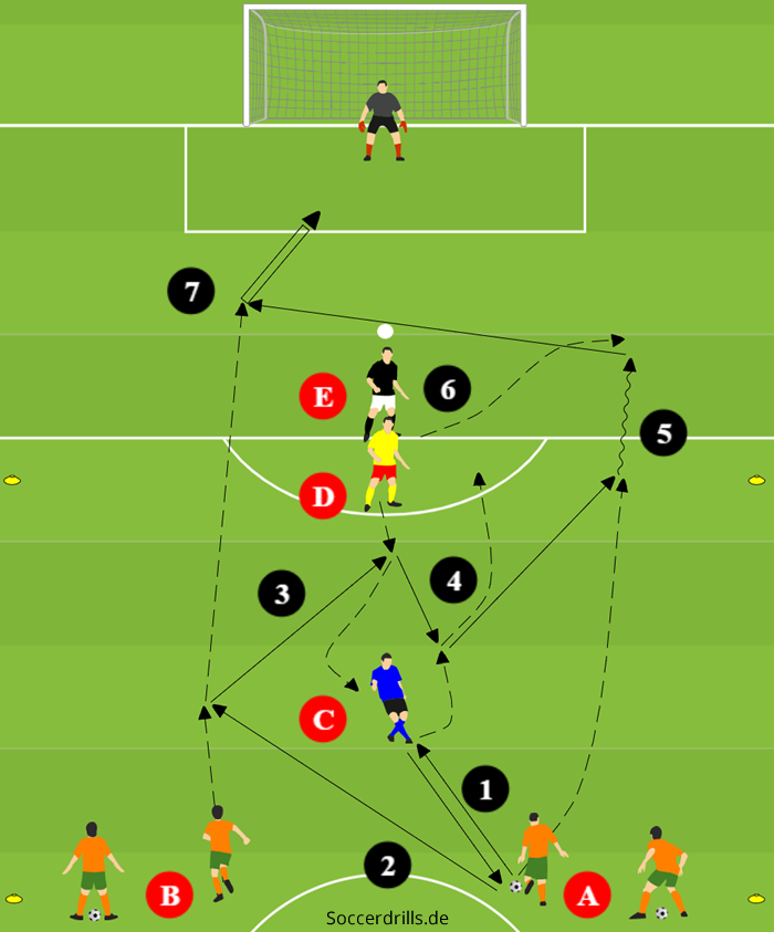 - C und D tauschen nach der Aktion die Aufgaben, E bleibt Verteidiger. Nach einigen Durchläufen werden sie auswechselt.