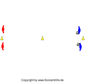 Ein Spieler läuft ständig zur mittleren Markierung und rückwärts zurück. Er wird dabei von seinem Mitspieler in der Vorwärtsbewegung angespielt und führt sofort einen Rückpass aus.