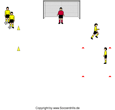 - Weiteres Zuspiel auf die Flügelposition, dann Flanke vors Tor.
