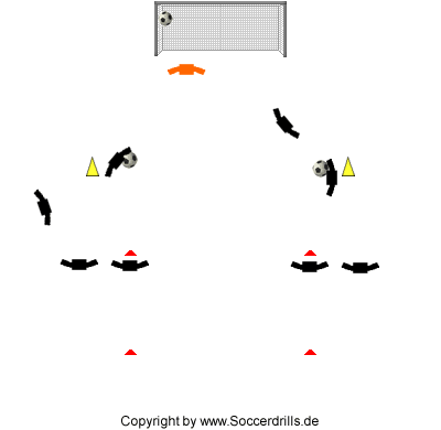 - Die Spieler starten mit dem Rücken zum Tor, um dann aus der Drehung anzutreten.