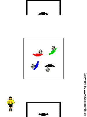 Material: Jeder Spieler hat einen Ball, 4 Hütchen oder Bodenmarkierungen fürs Zentralfeld, 2 Tore.