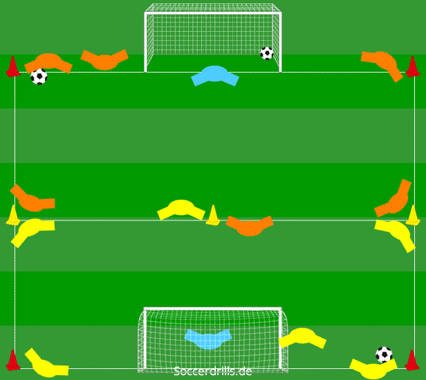 - Markiere das Übungsfeld so, wie in der Grafik zu erkennen ist. Die Abstände sind der Intensität geschuldet, die Torschüsse sollten von der Strafraumgrenze erfolgen.