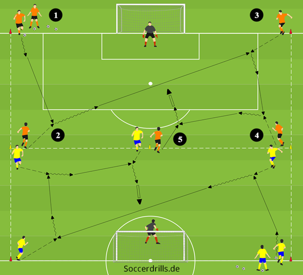Du kannst die Intensität dieser Trainingsübung gezielt steuern. Die Abstände der Positionen zueinander können vergrößert oder verkleinert werden. Es ist lediglich darauf zu achten, dass der Torschütze nicht zu dicht vors Tor kommt. In der Breite kann das Übungsfeld bis zu den Seitenlinien reichen und in der Tiefe kann ab Mittellinie gestartet werden.