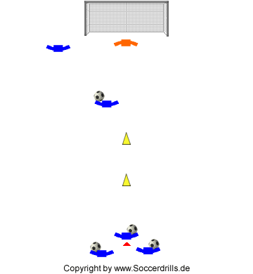 Material: Ausreichend Bälle, 1 Startmarkierung, 2 Hütchen, 1 Tor.