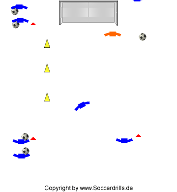 Material: Ausreichend Bälle, 3 Bodenmarkierungen, 3 Hütchen, 1 Tor.