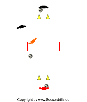 Material: Jeder Spieler hat einen Ball, 1 Tor mit Stangen oder Hütchen markiert, 4 Hütchen zur Erzwingung der Ballablage.