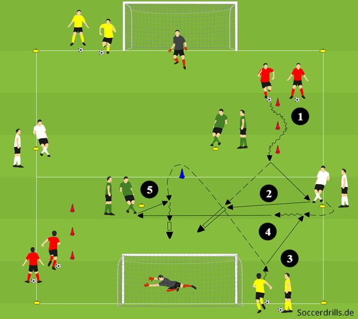 - Grün passt in den Lauf von Gelb, der mit oder ohne vorherige Ballkontrolle aufs Tor schießt.