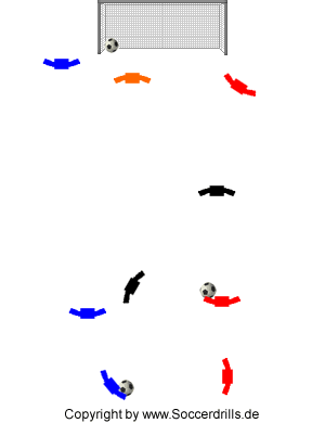 Zwei Spieler stehen sich gegenüber und passen sich den Ball zu. Der Spieler "Blau" in der Animation passt auf den ersten Spieler im Zentrum vor dem Tor. Die Aufstellung der Anspieler entspricht der vorherigen Übung. Der zweite Startspieler ist zwischenzeitlich in Torrichtung gestartet und erhält ein genaues Zuspiel vom Anspieler. Er kontrolliert den Ball und passt dann auf den zweiten Anspieler. Dieser passt horizontal auf den, in Position gelaufenen, ersten Anspieler, der einen Torschuss ausführt.