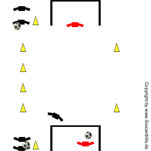 Ein Spieler startet mit dem Dribbling durch den Slalomparcours. Anschließend wechselt er dribbelnd zum Hütchen auf die andere Seite. Hier führt er eine Wende (Turn) aus. Aus der Wende erfolgt der Pass auf den startenden Spieler der nächsten Gruppe, Anschließend erfolgt der Torschuss. Nun startet die andere Gruppe mit dem Dribbling.