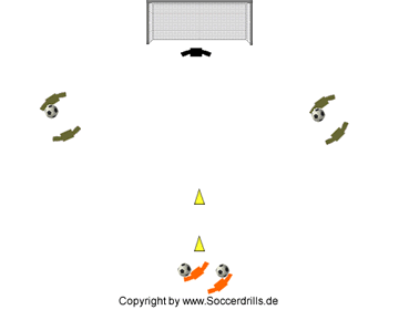 Aus dem Zentrum laufen die Übenden mit Ball, nach kurzem Slalom, zum Torschuss an. Auf den Flügelposition befindet sich jeweils ein Spielerpaar. Diese Paare versuchen, nach ein kurzen Kombination mit Hinterlaufen, Flanken oder Pässe vors Tor zu schlagen. Die Zentrumsspieler verwerten die Bälle von den Flügelpositionen zu weiteren Toraktionen. Gruppentausch nach der Aktion möglich.