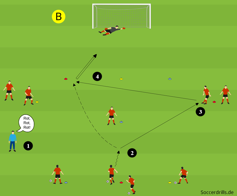 - Der Spieler aus der Mittelreihe passt exakt in den Lauf des Startspielers, der mit einem Torschuss abschließt.