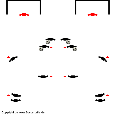 Zwei Tore, zwei Rechtecke mit insgesamt 8 Stationen. Schaue Dir die Animation genau an, vier der acht Stationen sind immer nur mit einem Spieler besetzt. Im ersten Schritt dieser Trainingseinheit erkennst Du in der Animation zwei, unabhängig voneinander übende Gruppenteile. Die Teilung erfolgt vertikal in der Mitte des Übungsfeldes.
