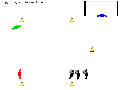 Sehr komplexe Übung zum Torschusstraining im Fußball. Neben Kurzpässe, Doppelpässe, Diagonalpässe trainieren wir auch das Freilaufen. Präge Dir die Animation gut ein!