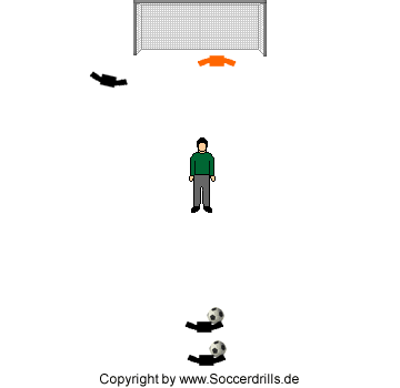 Eine Gruppe mit Spielern. Sie bewegen sich nacheinander dribbelnd auf den Trainer zu. Kurz bevor sie den Trainer erreichen, deutet der Trainer mit den Armen die Bewegungsrichtung an. Links, rechts oder zentral vom Trainer wird geschossen. Bei "zentral" sollte der Coach rechtzeitig Platz für den Schuss machen.