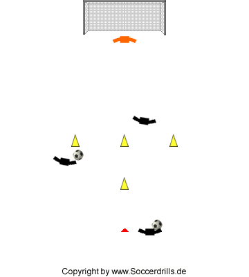 Drei Hütchen stehen im Zentrum des Übungsfeldes, nicht zu dicht vorm Tor. Ein weiteres Hütchen steht 2 bis 3 Meter von dieser Hütchenreihe entfernt. Beim Übungsstart muss ein Spieler die Position des Anspielers zwischen den Hütchen besetzen. Der Startspieler dribbelt von der Markierung in Richtung Tor. Er passt zum Anspieler zwischen den Hütchen und umläuft zwei zentrale Hütchen auf der Seite des Passempfängers. Er erhält durchs Hütchentor hindurch den Rückpass, umdribbelt das linke Hütchen und passt genau in den Lauf des startenden Spielers. Jetzt noch der Torerfolg, dann ist es perfekt.