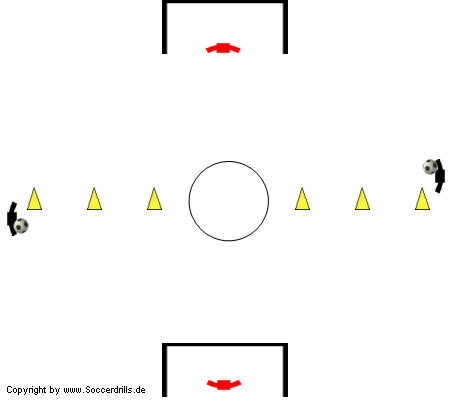Material: Jeder Spieler hat einen Ball, 2 Tore, 6 Hütchen oder Bodenmarkierungen für den Slalom, Mittelkreis oder Markierungen.
