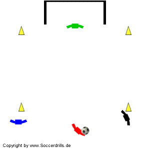 Material: Ausreichend Bälle, 1 Tor, 4 Hütchen oder Markierungen zur Orientierung.
