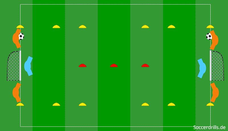 - Neben den Toren wird jeweils eine Startmarkierung ausgelegt. An diesen Markierungen werden die Spieler postiert. In der Grafik befinden sich die Ballgruppen oben.