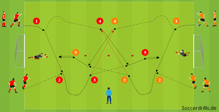Starte einfach und beginne mit dem Ablauf von einer Seite. Im Zentrum passen sich die beiden gestarteten Akteure den Ball untereinander durch die Markierungen zu und der letzte Passempfänger schießt aufs Tor.