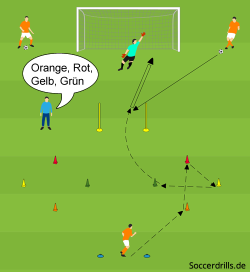 Material: Ausreichend Bälle, 2 x 4 verschiedenfarbige Hütchen, 2 Stangen, 2 Startmarkierungen, 1 Tor.