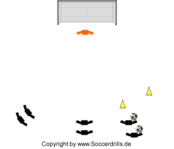 In der Startgruppe erhält jeder Spieler einen Ball. Der erste Übende dieser Gruppe dribbelt um das vordere Hütchen herum, um den Ball auf den ersten Spieler der mittleren Gruppe zu passen. Der Passgeber startet sofort um das, sich in seinem Rücken befindliche Hütchen, um dann am Ende des Übungsablaufes einen gezielten Torschuss auszuführen. Der Passempfänger der zweiten Gruppe leitet den Ball weiter in die dritte Gruppe. Aus dieser Gruppe erfolgt dann der finale Pass. Nach der Aktion rücken die Spieler zur jeweils nächsten Gruppe auf.