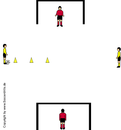 Zwei Tore und zwei Gruppen, links und rechts an den Seiten des Übungsfeldes. Die linke Gruppe wird mit Bällen ausgestattet. Der erste Spieler der Reihe startet mit Slalomdribbling durch die Hütchen und passt dann flach auf den Torwart, der den Ball aufnimmt. Anschließend läuft der Passgeber einmal um die Hütchenreihe herum, um dort ein Anspiel zum Torschuss zu erhalten. Der Torwart rollt oder wirft den Ball in die rechte Gruppe des Spielfeldes. Der erste Spieler dieser Gruppe kontrolliert den Ball und spielt einen genauen Pass zum Torschuss auf den freigelaufenen Spieler. Torschütze und Passgeber können nach der Aktion die Gruppen tauschen.