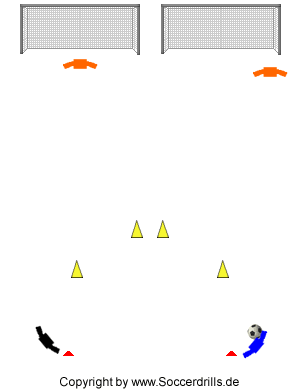 Material: Ausreichend Bälle, 2 Bodenmarkierungen, 4 Hütchen, 2 Tore.