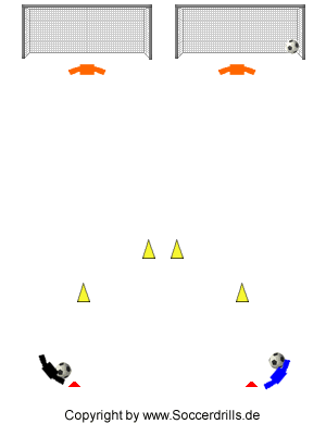 Material: Ausreichend Bälle, 2 Bodenmarkierungen, 4 Hütchen, 2 Tore.