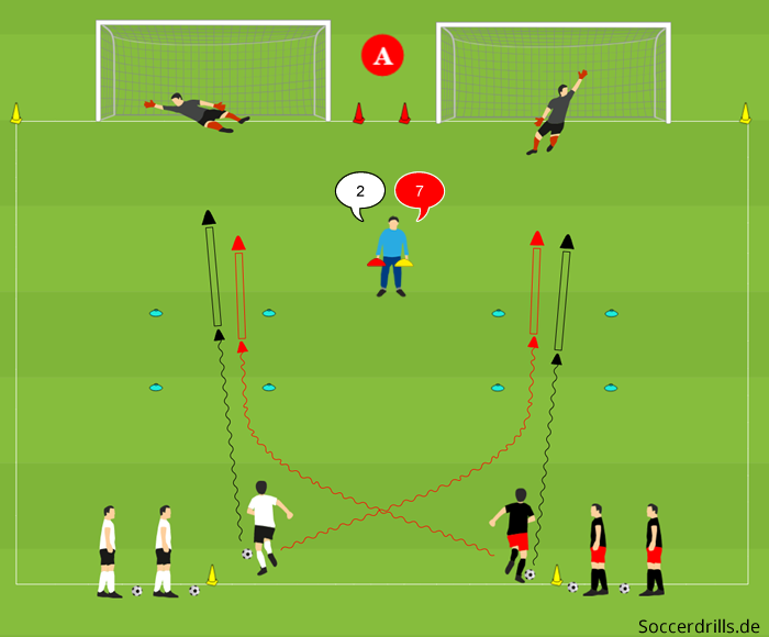 - Beispiel: Beim Startkommando und Sprint in die entsprechende Zone wird eine Zahl aufgerufen. Die Spieler sprinten zurück und holen die Bälle. Jetzt wird eine weitere Zahl aufgerufen und die Akteure dribbeln in die entsprechende Schusszone und schießen auf die Tore.