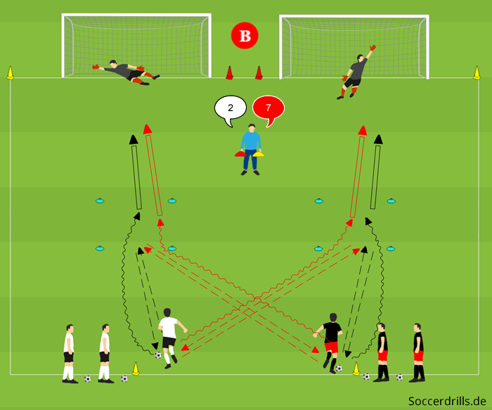 - Die Trainingsgruppe wird in zwei Teams eingeteilt, mindestens die Startspieler verfügen über Bälle.