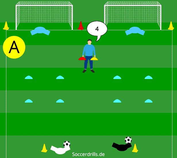 - Der Trainer hält zusätzlich zum Ruf eine Bodenmarkierung hoch. Die Spieler starten nach dem Torschuss zum Hütchen, das farblich mit der hochgehaltenen Markierung übereinstimmt und berühren es. Wer zuerst ein Tor erzielt erhält einen und wer zuerst das richtige Hütchen berührt einen weiteren Punkt.