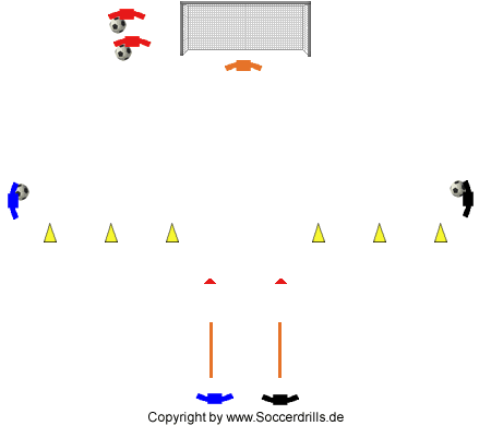 Material: Ausreichend Bälle, 2 Bodenmarkierungen, 6 Hütchen, 1 Tor, 2 Stangen.