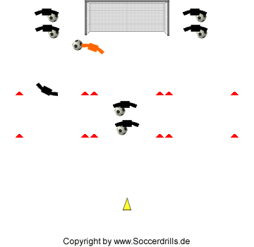 Material: Ausreichend Bälle, 1 Hütchen, 12 Bodenmarkierungen, 1 Tor.