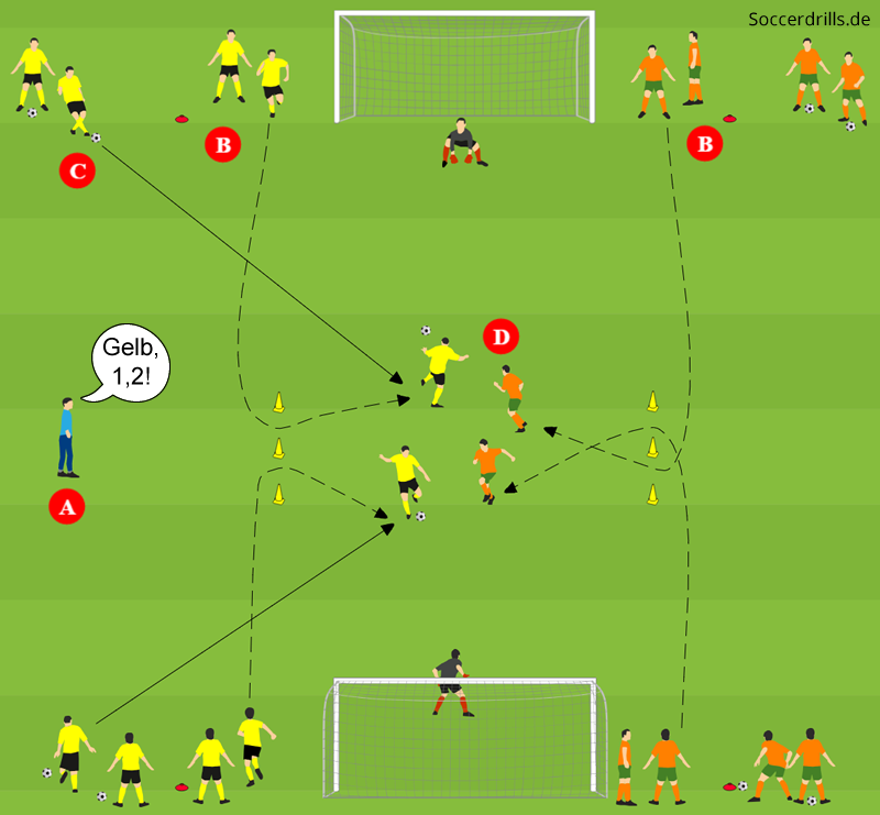 - Der erste Spieler aus der Pass- und Schussgruppe (hier Gelb), passt seinen Mitspieler mit gutem Timing an. Der Spieler aus der anderen Gruppe stört den Torschützen und versucht bereits den Pass abzufangen.