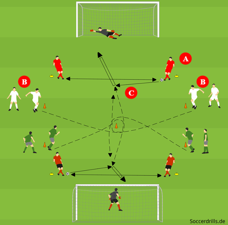 In einer Variante ist es dann möglich, ein akustisches Signal für den Start zu nutzen. Die Passspieler kontrollieren den Ball nicht mehr und der Trainer ruft ein Kommando zum Start ins Sprintduell. Die Spieler sollen dabei einen anderen Laufweg nutzen, nämlich diagonal auf die andere Übungsseite. Dort erhält der schnellere Spieler dann den Pass zum Torschuss.