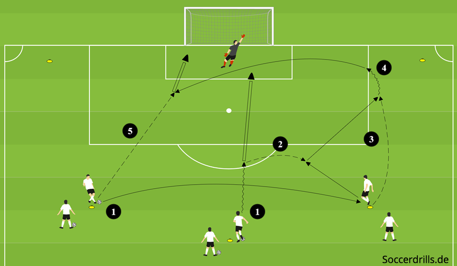 - Der Spieler, der den Pass auf den Flügel spielt, zieht zum ersten Pfosten. Die Flanke bzw. das Abspiel, kann dann auf den ersten oder zweiten Pfosten erfolgen.