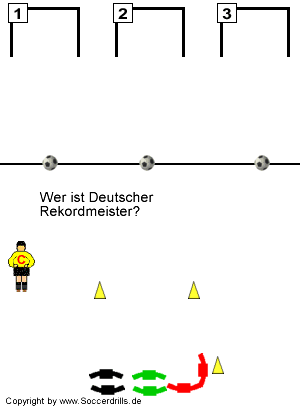 Der Trainer stellt eine Frage und gibt die Antworten 1, 2 oder 3 als Lösung vor. Die Teams beraten kurz (heimlich), bis sie meinen die richtige Lösung gefunden zu haben. Dann sprintet der erste Spieler des Teams los und versucht, einen der liegenden Bälle in das richtige Lösungstor zu schießen.
