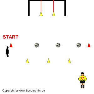 Der Trainer gibt das Startkommando und stoppt die Zeit (Empfehlung = Stoppuhr). Der Übende umläuft vor jedem Torschuss das entsprechende Hütchen. Für jeden Fehlschusss wird am Ende der Übung die erreichte Zeit erhöht. Verfehlt der Schütze das Tor total, wird die Zeit jeweils um 8 Sekunden erhöht. Trifft er die Mitte des Tores, beträgt die Zeitaddition jeweils 4 Sekunden. Nur bei platzierten Schüssen in die Torecken gibt es keine Strafzeit.