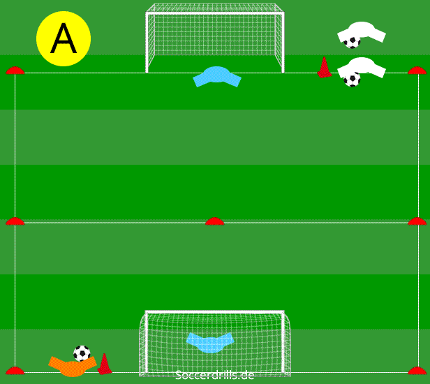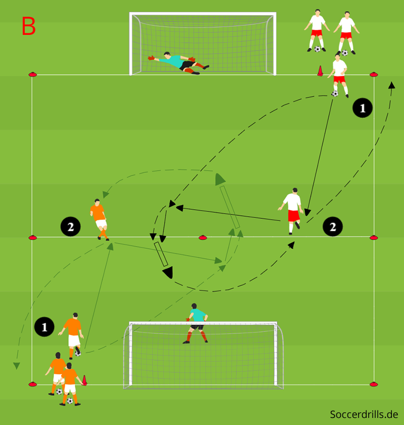 Der Torschütze übernimmt schnell die Position des Anspielers, der Anspieler startet in die Gruppe am Tor und organisiert sich vorher einen Ball.
