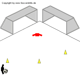 Der Torwart wehrt geschossene Bälle auf zwei Tore ab. Die Spieler dribbeln um die Hütchen herum und schießen von einer Position nach Wahl. Schussfinten sind nicht nur erlaubt, sondern ausdücklich gewünscht! Der Torwart versucht, durch gutes Stellungsspiel zwischen den Toren, einen Torerfolg zu vermeiden.