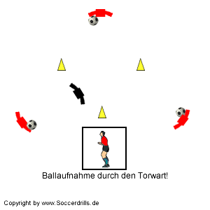 Der Torwart bewegt sich mit Sidesteps um das Dreieck und wird von den Mitspielern flach angespielt. Es erfolgt jeweils die technisch korrekte Ballaufnahme durch den Torwart. Nach Aufnahme (Oberkörper strecken, Ball sichern), rollt der Torwart den Ball zum Passgeber zurück. Tempo langsam erhöhen. Diese Übung ist für den Torhüter sehr intensiv, deshalb solltest Du rechtzeitig Pausen einlegen, oder den Torwart austauschen.